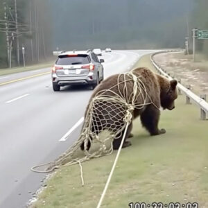 On the road, I noticed a bear tangled in a net, unable to free itself: