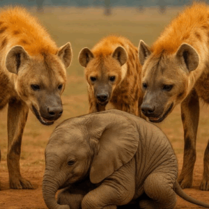 A pack of hyenas surrounded a small and helpless baby elephant, ready to attack – but you won’t believe who came to its rescue