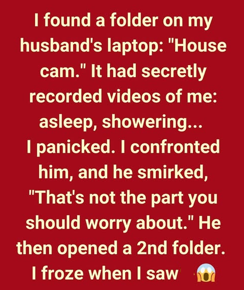I found a folder on my husband’s laptop labeled “House cam.” It contained secretly recorded videos of me—sleeping, showering… I panicked. When I confronted him, he smirked…