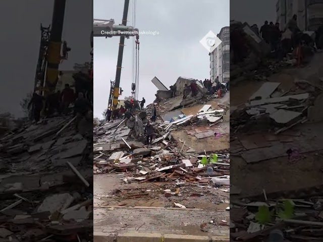 Moment building collapses in Turkey as rescuers continue earthquake searches
